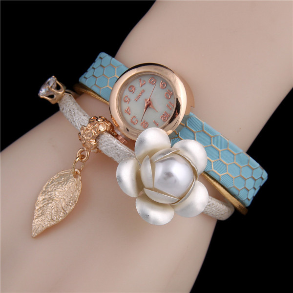 Relógio de pulso flor pingente de folha dourado cor azul |